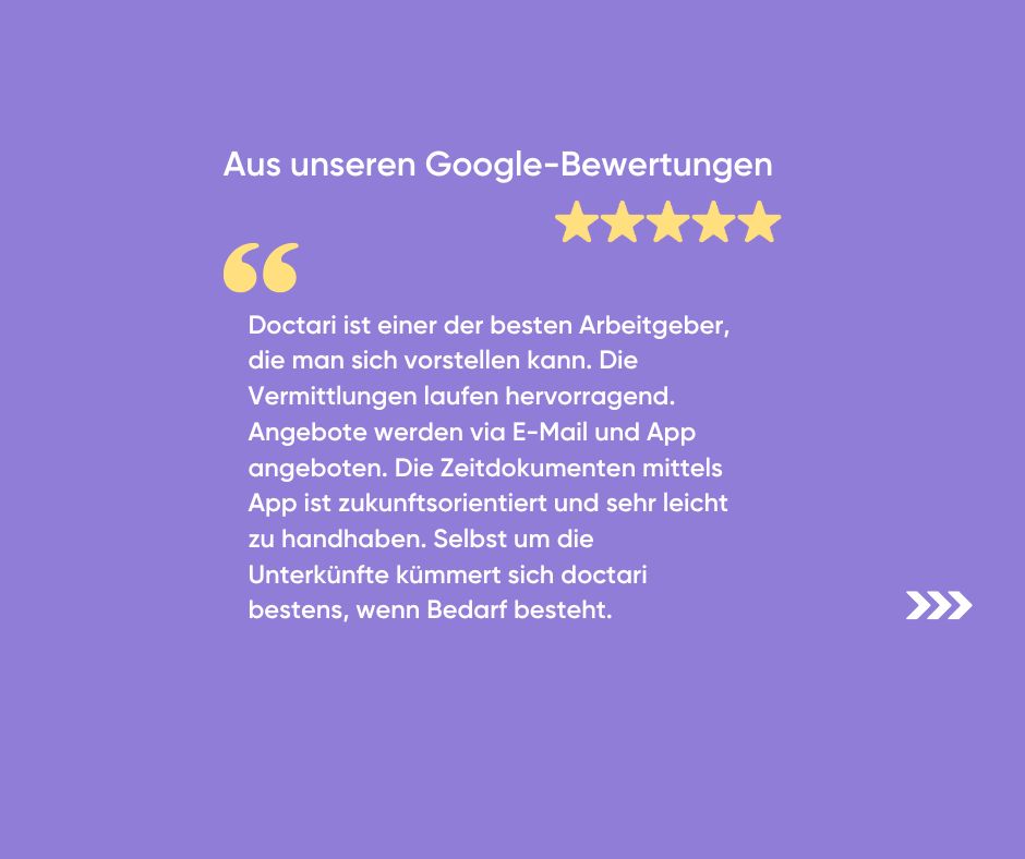 Unserer ÄrztInnen und Pflegekräfte berichten von ihrem Arbeitsalltag Jetzt registrierenHier kommen unsere Fachkräfte zu Wort – in Interviews, Podcast und Video berichten sie von ihren Erfahrungen mit doctari, der Nummer 1 für Zeitarbeit in der Medizin. Wie gut klappt die Zusammenarbeit? Welche Vor- und Nachteile hat das Arbeiten in der Zeitarbeit als Ärztin, Arzt oder Pflegekraft?